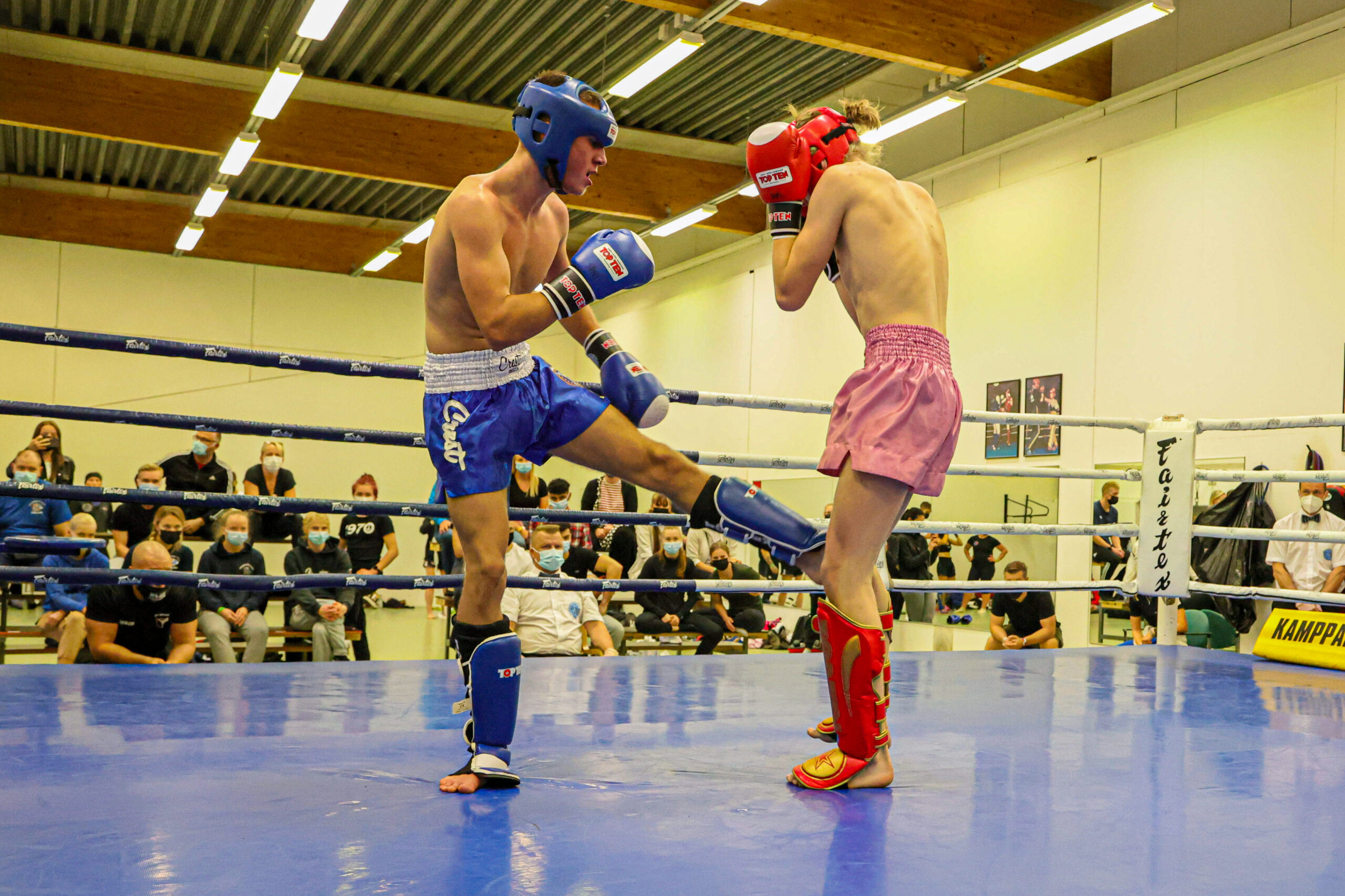 KBT Kokkolan John Englund voitti A-junioreiden K1 63,5-kiloisten loppuottelussa kaikin tuomariäänin MMA Team 300 Juuso Renforsin. Kuva: Espoon Kehähait