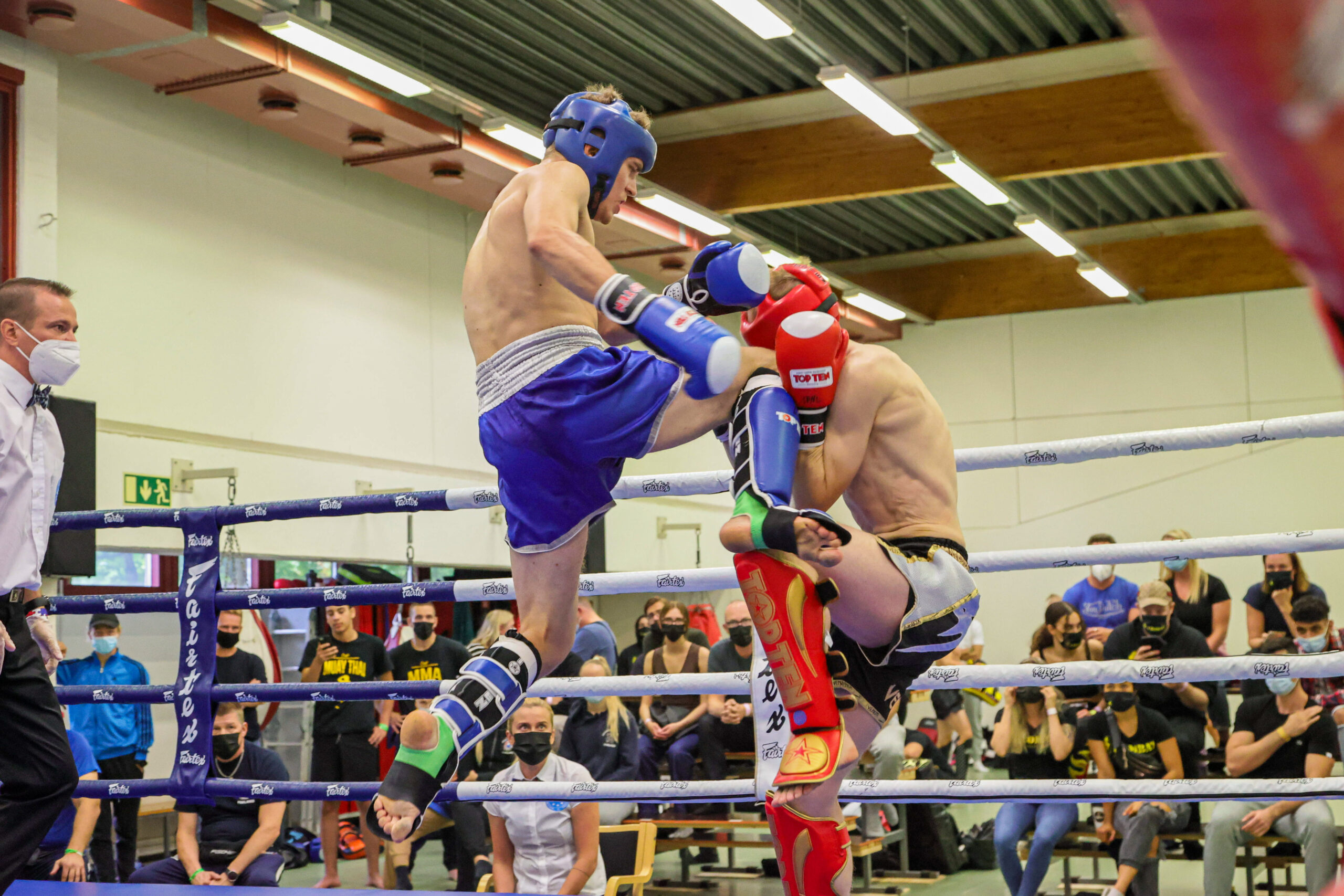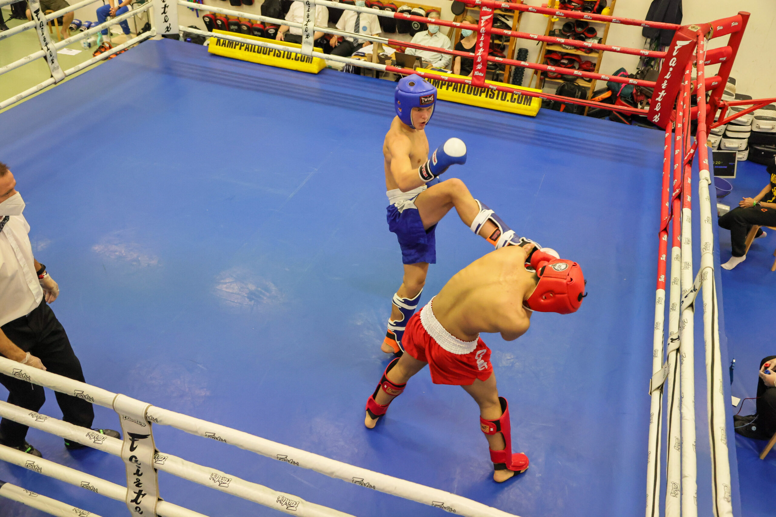 Oulun Kickboxing Teamin Lauri Suomela voitti hyppypolvityrmäyksellä miesten 67-kiloisten finaalissa Tampereen MMA Team 300 Oskar Lundenin. Kuvat: Espoon Kehähait