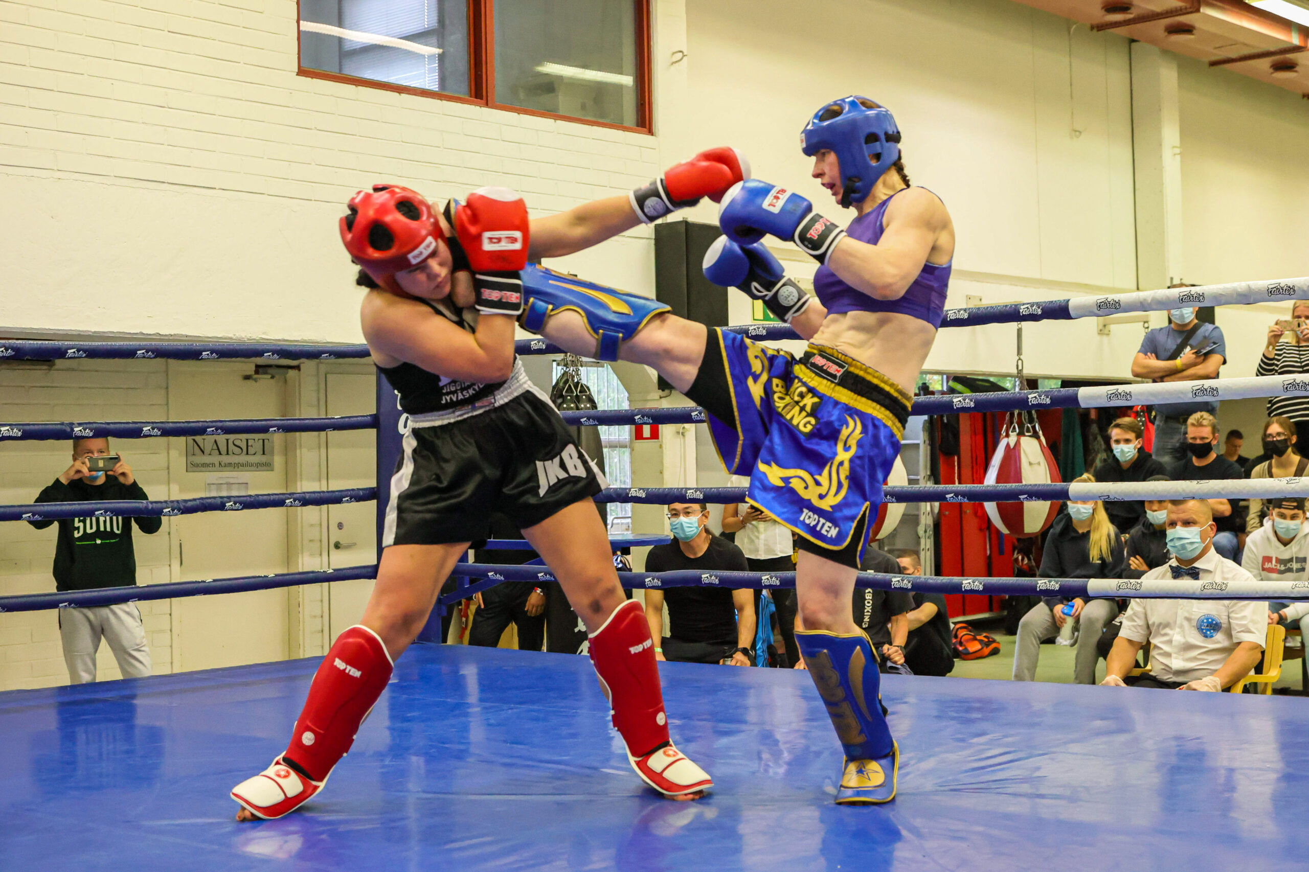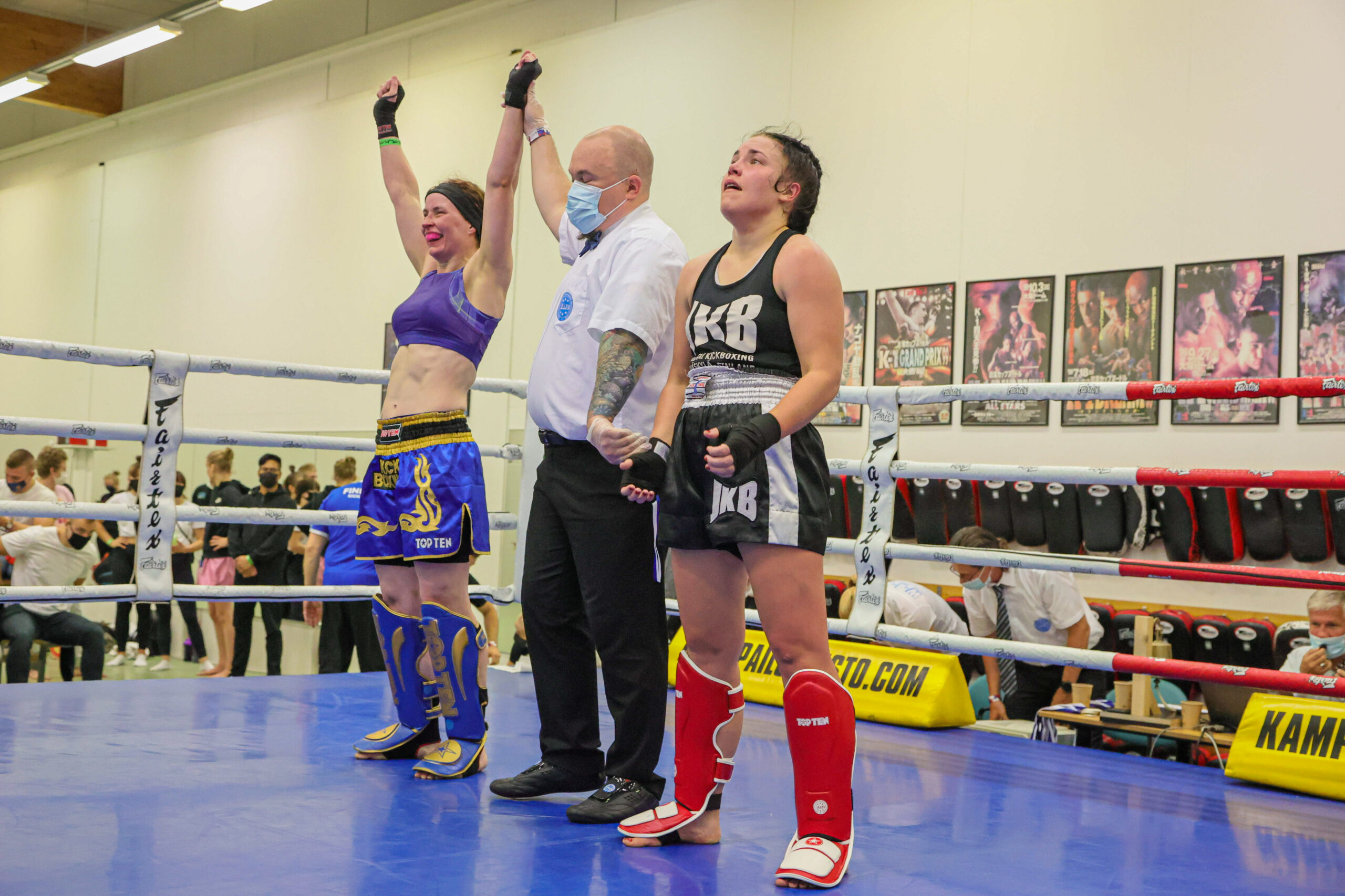 Valtikka vaihtui naisten K1 52-kiloisissa, kun Jyväskylän Jigotai Kickboxingin Elsa Närhi päihitti GB Gymin Noora Al-Saffun tuomariäänin 3-0. Kuvat: Espoon Kehähait