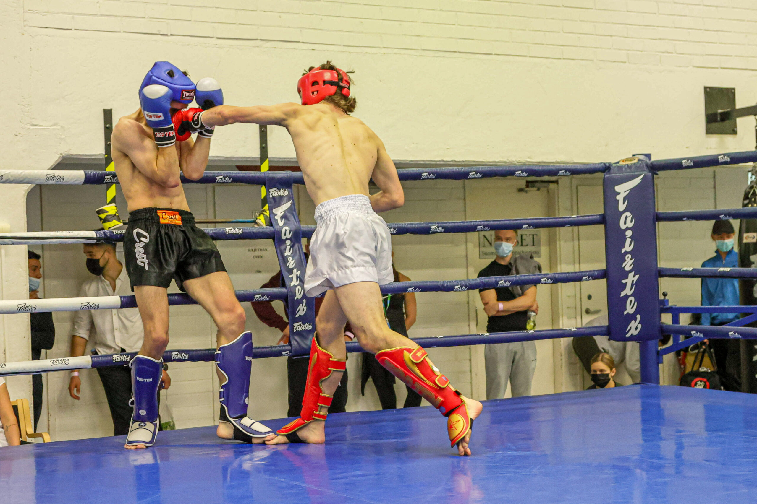 Rauma Fight Clubin Mikko Tirronen voitti miesten K1 81-kiloisten loppuottelussa Jyväskylän Sportfightersin Marko Ranton kolmannen erän keskeytyksellä. Kuvat: Espoon Kehähait
