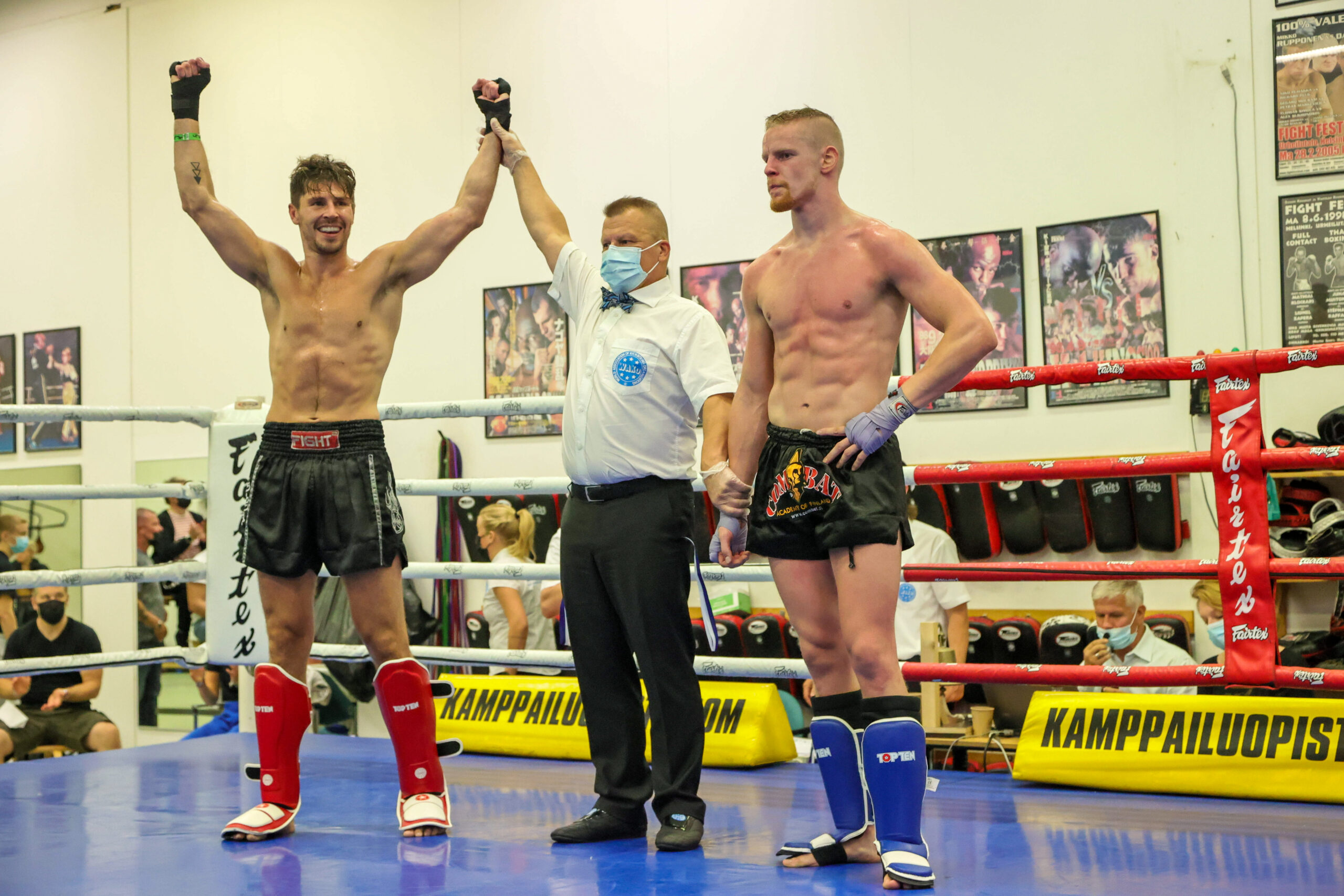Tampereen MMA Team 300 Elmo Peltonen voitti miesten K1 71-kiloisten loppuottelussa Turun Kontaktikarateseuran Atte Kähärin tuomariäänin 2-1. Kuvat: Espoon Kehähait