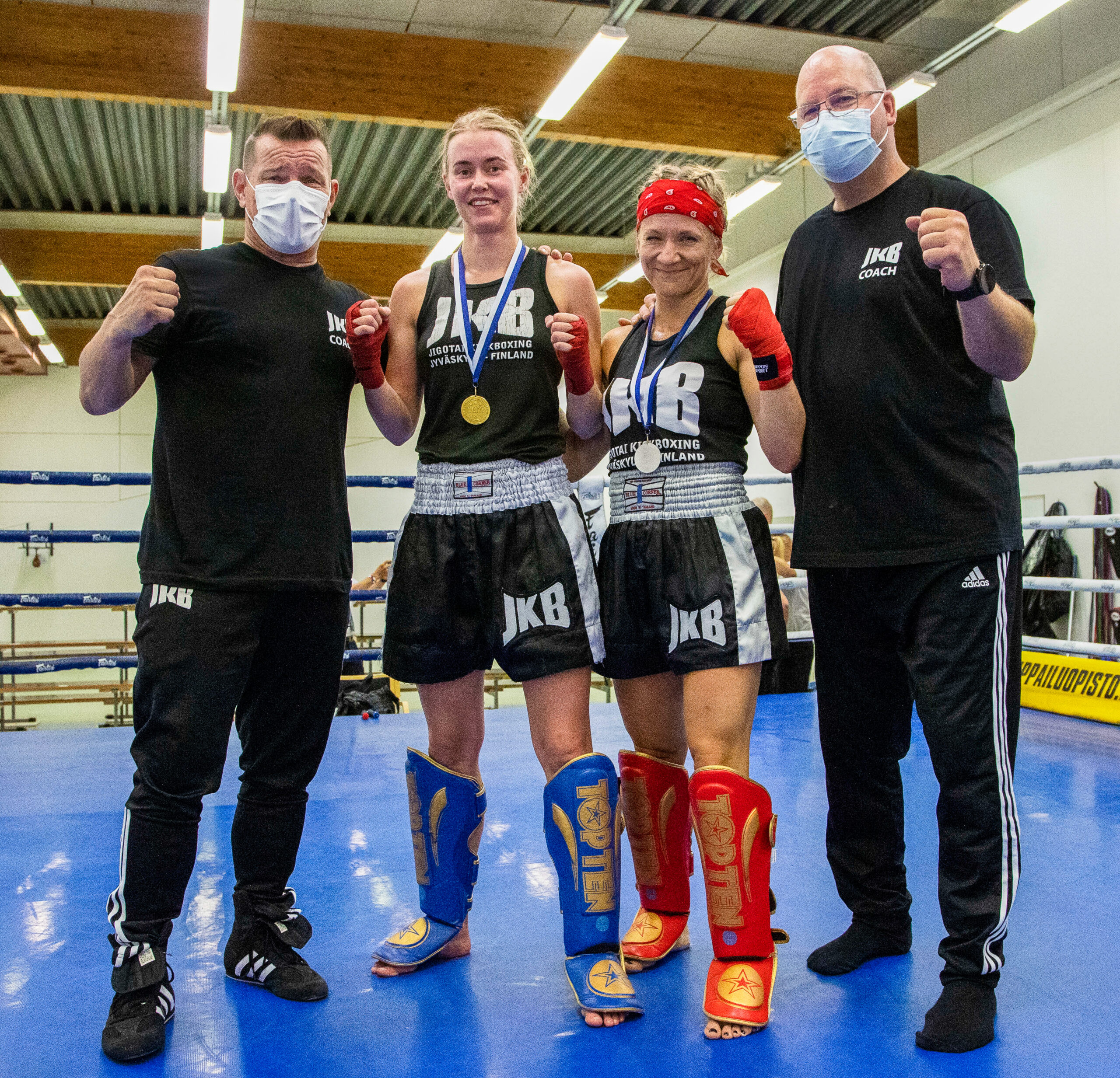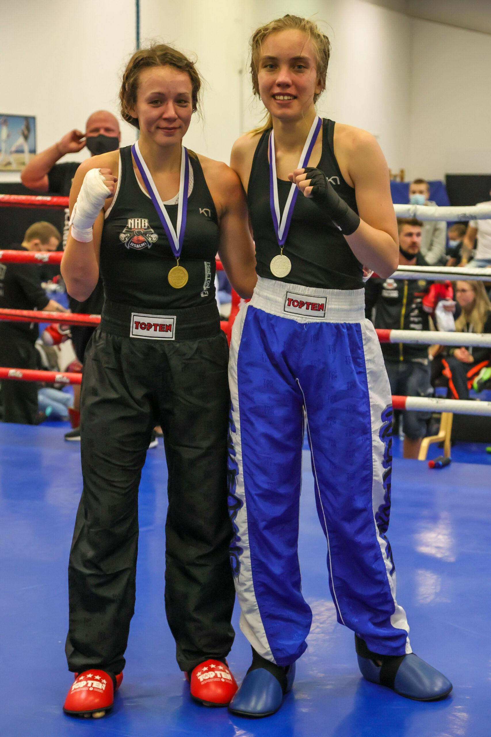 Jyväskylän Jigotai Kickboxing iski naisten K1 56-kiloisten kaksoisvoiton, kun kultaa saalisti Essi Honkonen ja hopealle iski Janita Immonen. Finaali kirjattiin Essin nimiin kaikin tuomariäänin 3-0. Kuva: Espoon Kehähait