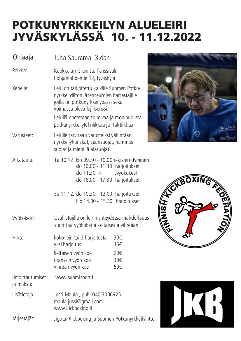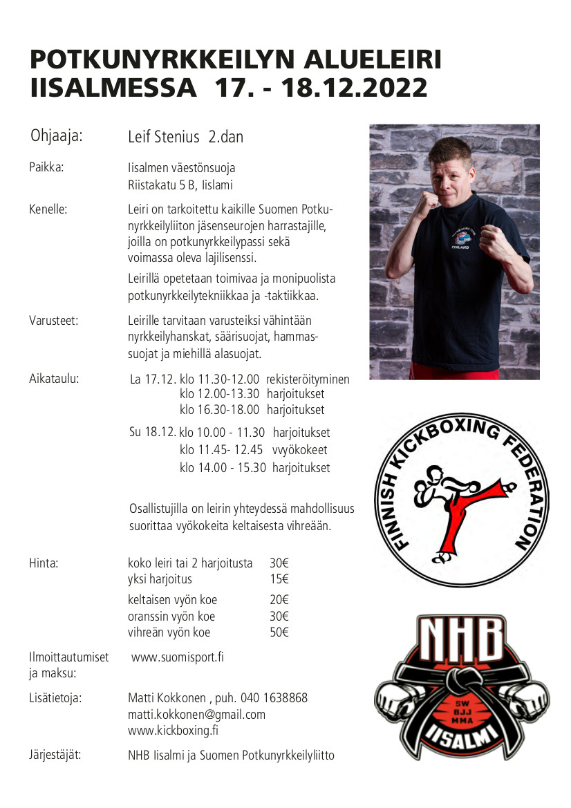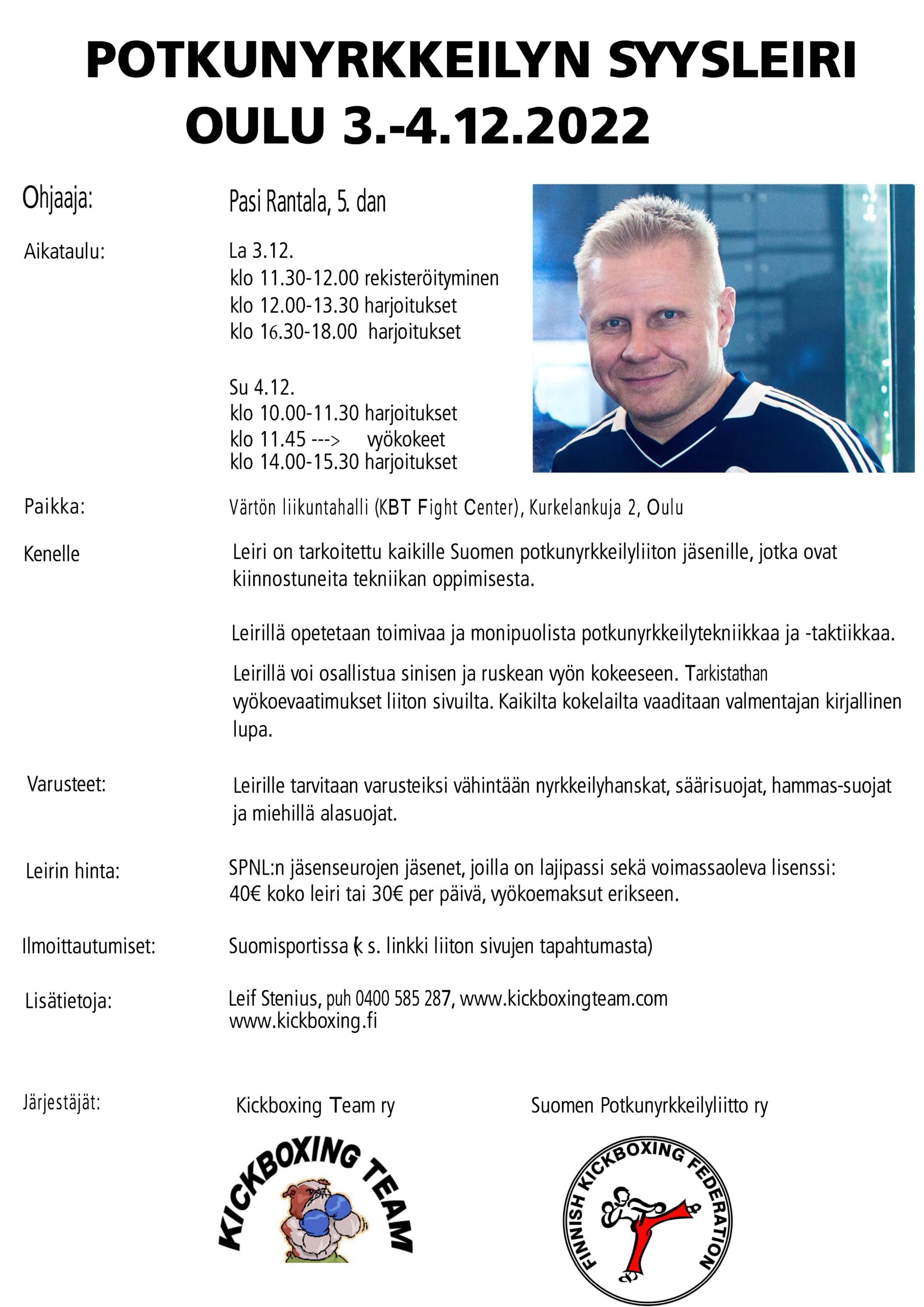 Jokainen näistä leireistä on tarkoitettu kaikille Suomen Potkunyrkkeilyliiton jäsenille, jotka ovat kiinnostuneita toimivan tekniikan ja taktiikan oppimisesta.