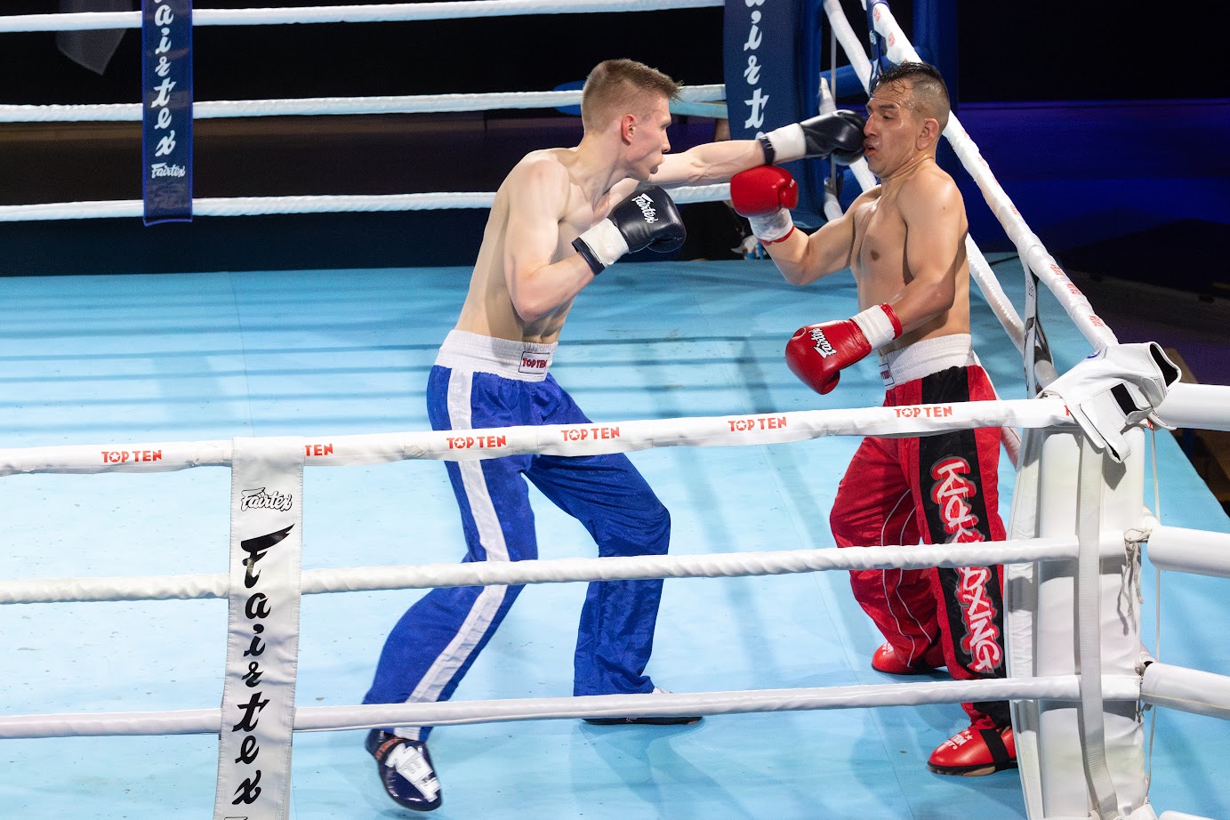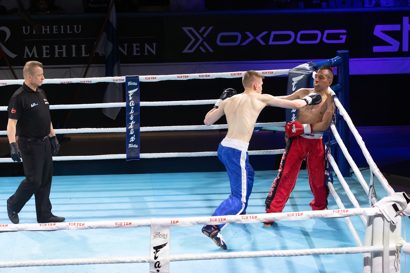 Pääkuvassa Tatu Maunu (sin.) voittoisassa EM-ottelussaan Milton Barrios Galerretaa vastaan (vas.) ja naisten K1 -60 kiloisten finaaliottelussa vastakkain Espoon Kehähaiden Emmi Saarela (pun.) ja Katarina Stenbacka, Pietarsaaren Ju-jutsu. Kuvat: Tuukka Maunu.
