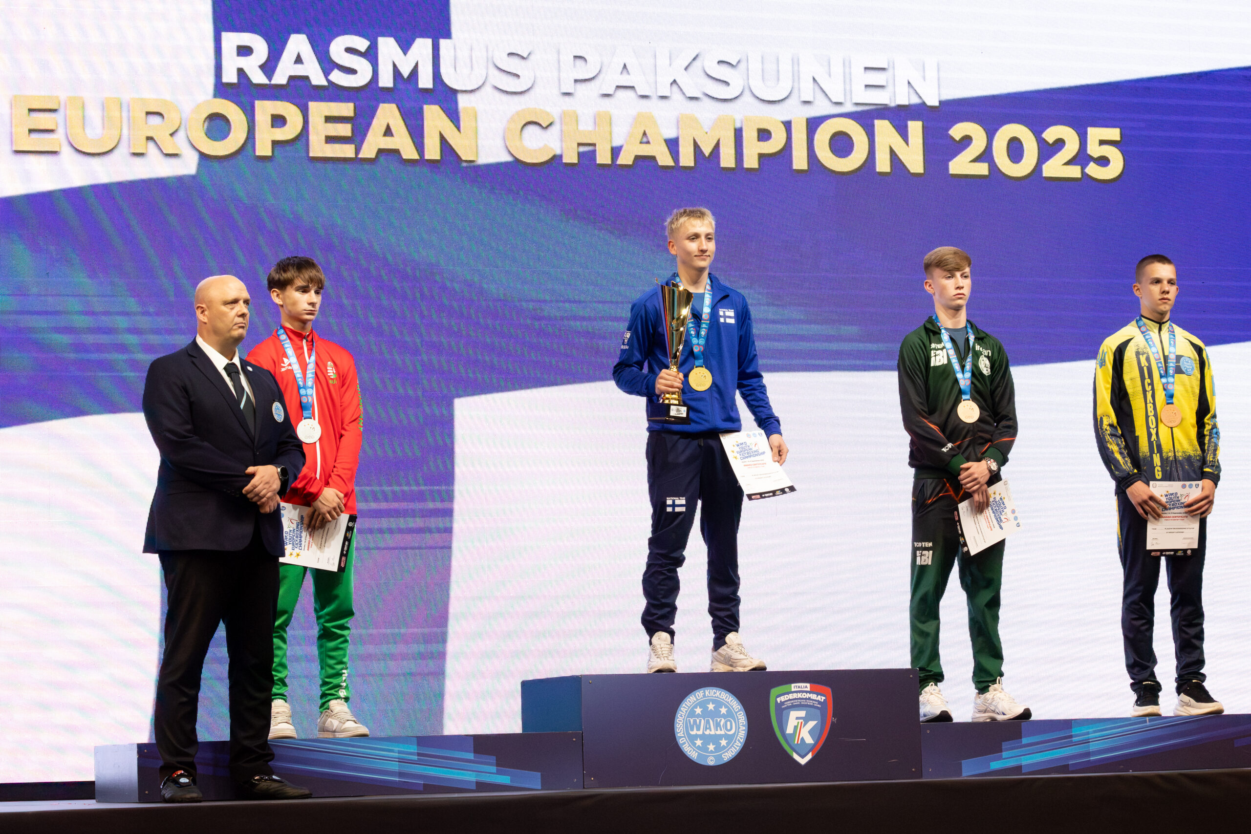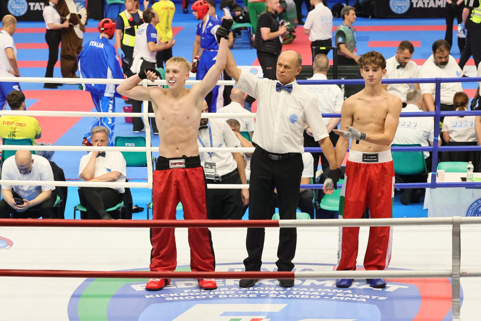 Järvenpään Kehäkarhujen Rasmus Paksunen (FC B-juniorit -60 kg) voitti kultaa, Espoon Kehähaiden Sheerin Wadhwa Kachru (K1 B-juniorit -56 kg) iski hopeaa, Jigotai Kickboxingin Helmi Lindgren (K1 A-juniorit -65 kg) niin ikään hopeaa ja Tampereen Kamppailuakatemian Leo Räty (K1 B-juniorit -51 kg) pronssia.